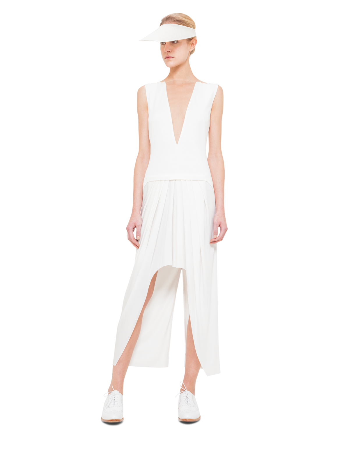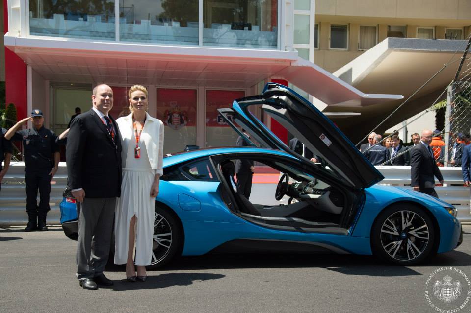 Arriving with Prince Albert in the new BMW i8 Electric Hybrid Supercar, Her Serene Highness was wearing a calcite white dress from Akris.