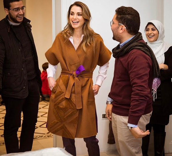 Last month, Queen Rania visited the Phi Science Institute in Amman. The Queen of Jordan wore a Fendi virgin wool coat in brown with purple lining and paired it with Etro pants and an Alexander Wang shirt. Jimmy choo pumps were the finishing touch to the look.