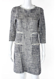 The ivory and navy marled (not grey, apparently) dress is Louis Vuitton!