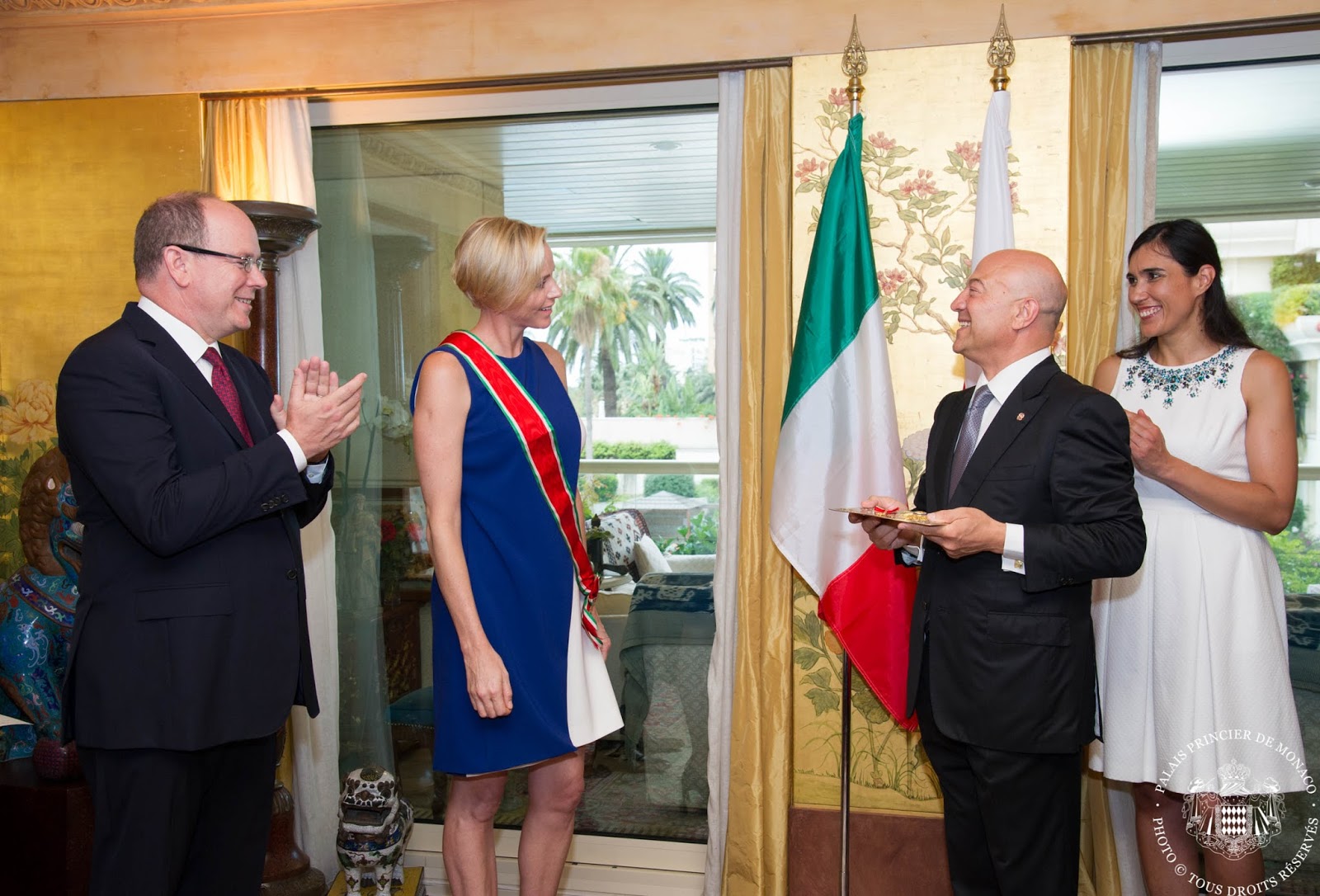 Back in the summer of 2014, Princess Charlene wore a Dior dress to attend a ceremony at the Italian Embassy in Monaco where she was awarded the honorific distinction of Knight Grand Cross of the Order of the Star of Italy. You can read the original post HERE.